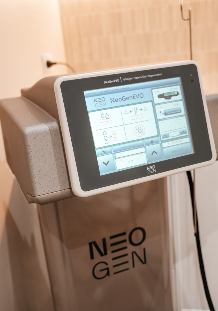 NeoGen converts nitrogen gas into plasma energy, which is delivered into the skin to create a controlled thermal response. This kickstarts your skin’s natural regeneration, stimulating new collagen and elastin while resurfacing and smoothing the outer layers. Unlike lasers, it doesn't ablate the skin, so downtime is reduced and results continue to improve over weeks.